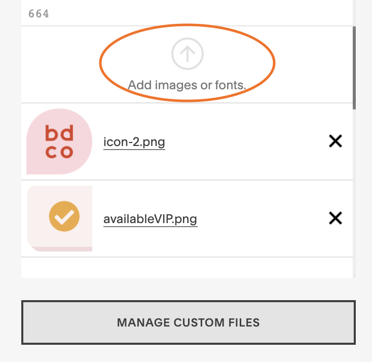 The first thing we need to do is upload the actual font file. Head to Website > Website Tools > Custom CSS > Custom Files. Click on "Add images or fonts." to select the font file from your computer. This should be a .ttf or .otf file.