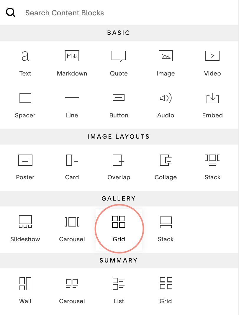 Under that text section, click the blue (+) to add a new section. Instead of blank, select a Gallery Section. Select any of the options that appear (we’ll change it in a second), and a gallery section should add on to your page.