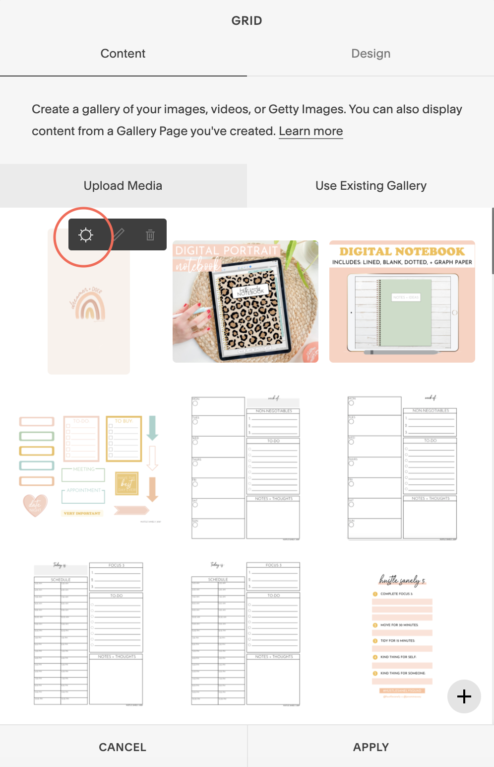 To edit the styles of your gallery section, click the little pencil icon. Here you can try out different gallery layouts, adjust spacing between images, add animations, and more.